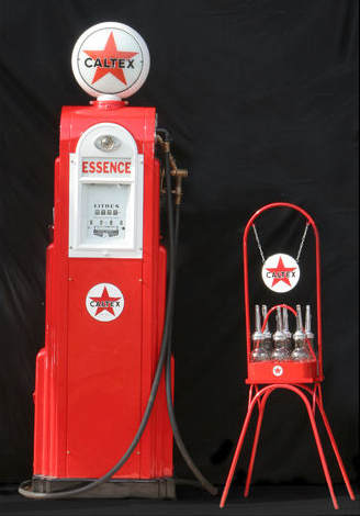 Pompe restaurée comme à l'origine aux couleurs Caltex, avec son porte-panier bouteilles d'huile. A l'épôque, celle-ci avait été élue "La plus belle pompe du monde". Produit non disponible en ce moment
